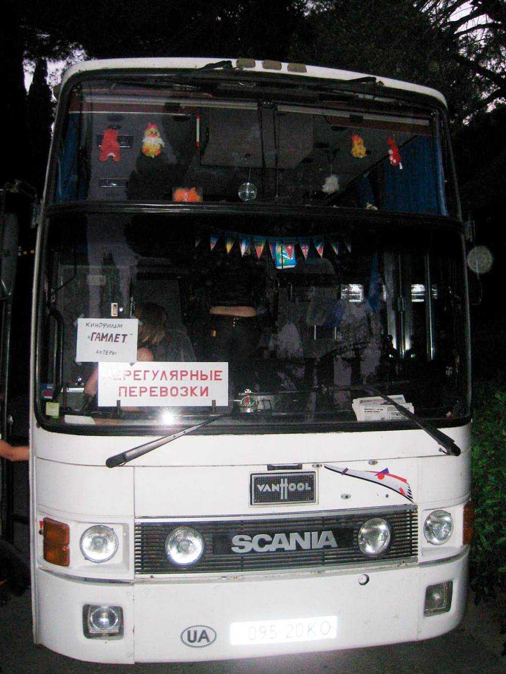 Автобус, на котором массовку возили до места съемок и обратно. На лобовом стекле надпись: «Кинофильм „Гамлет“, актеры»